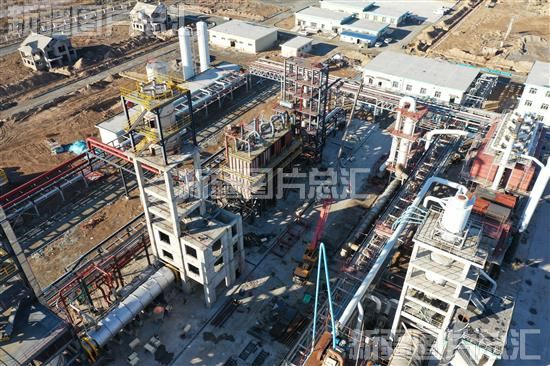 2022年11月11日,工人在新疆峻宇锂离子电池炭黑导电剂项目施工现场作业(无人机拍摄)。