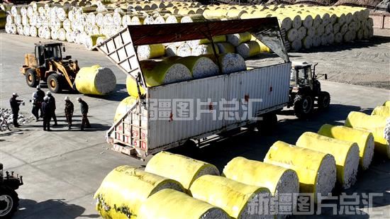 2022年11月11日,新疆生产建设兵团第一师阿拉尔市鹏发棉业有限公司职工在棉花加工厂堆放新棉。