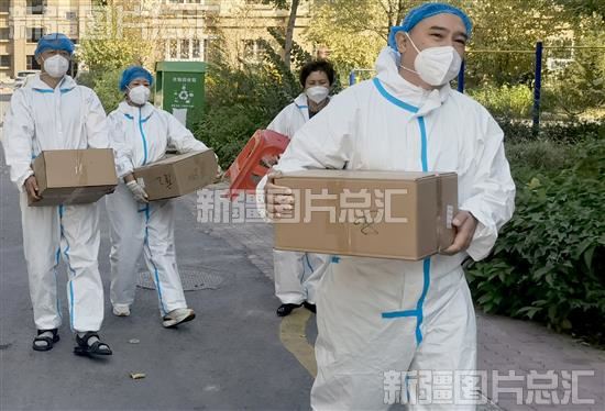2022年11月7日,乌苏市住房和城乡建设局驻新市区街道文景路社区“访惠聚”工作队队员为居民配送物资。