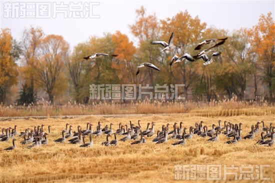 2022年11月9日,一群大雁在新疆生产建设兵团第一师三团水稻田栖息。