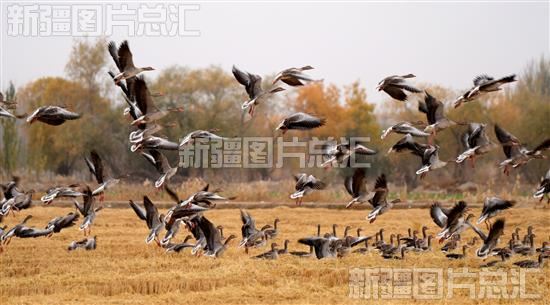 2022年11月9日,一群大雁在新疆生产建设兵团第一师三团水稻田栖息。