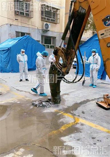 2022年11月10日,和田玉泉水务有限责任公司维修人员正在抢修供水管道。 张亚辉 摄