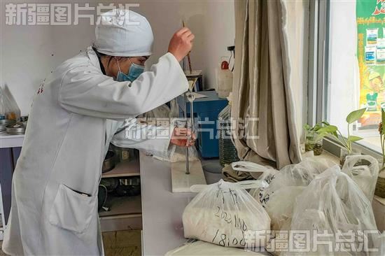 2022年11月16日,新疆金麦粮油有限公司化验员在抽检刚下线的面粉。