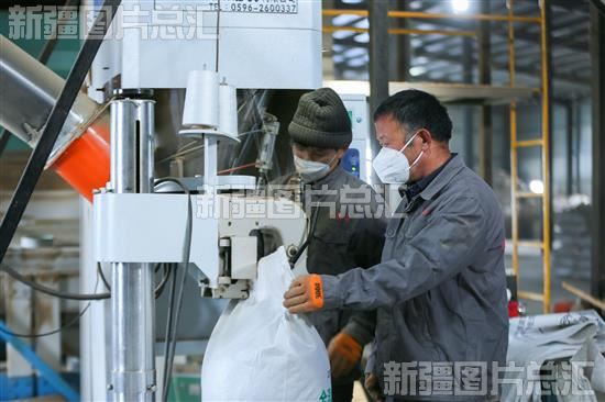 2022年11月21日,呼图壁县石梯子乡的加乐恩草畜养殖农民专业合作社工人在饲料加车间生产饲料。