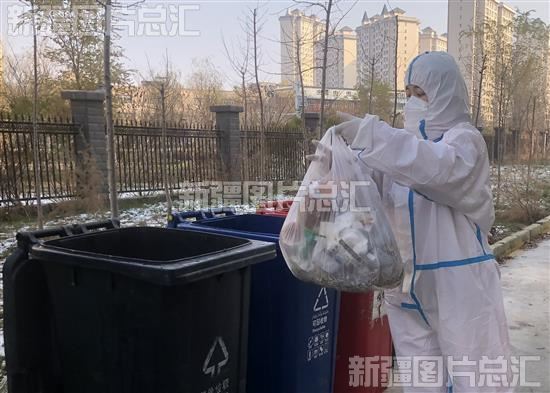 2022年11月18日,新疆计量测试研究院职工阿尔达克·马德提帮居民倒垃圾。王辉摄