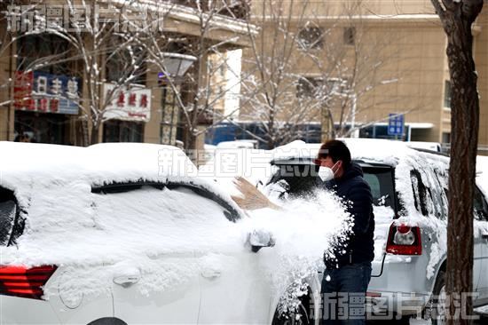 2022年11月27日,居民在新疆生产建设兵团第六师101团青湖镇南泉社区小区清理小轿车上的积雪。