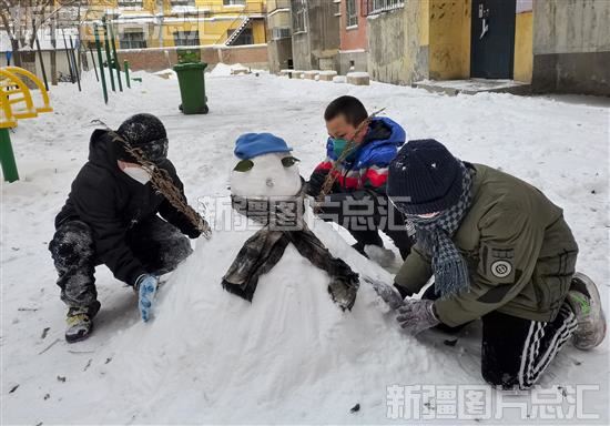 2022年11月27日,乌鲁木齐市天山区南湾街街道波斯坦巷社区小朋友在院内堆雪人。
