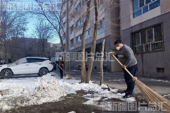 2022年11月26日,奇台县犁铧尖社区爱心小屋志愿者在辖区图书馆小区清扫积雪。