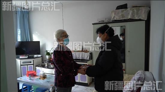 2022年11月25日,哈密市伊州区城北街道阳光社区,总联户长郑爱兰在独居老人赵年英家中探望。