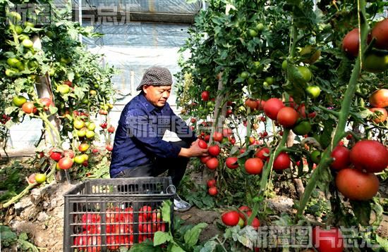 11月24日,职工沈世力在新疆生产建设兵团第二师二十二团七连自己的4亩设施农业大棚里采摘西红柿。
