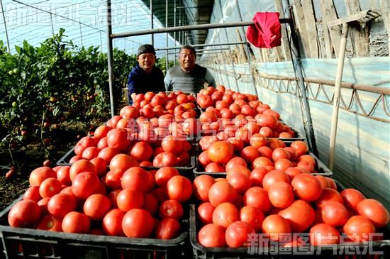 11月24日,职工沈世力在新疆生产建设兵团第二师二十二团七连自己的4亩设施农业大棚里采摘西红柿销售。