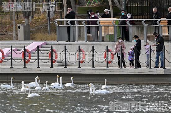 2022年11月27日,市民在库尔勒市孔雀河观赏天鹅。
