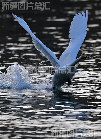2022年11月27日,天鹅踏水在库尔勒市孔雀河起飞。