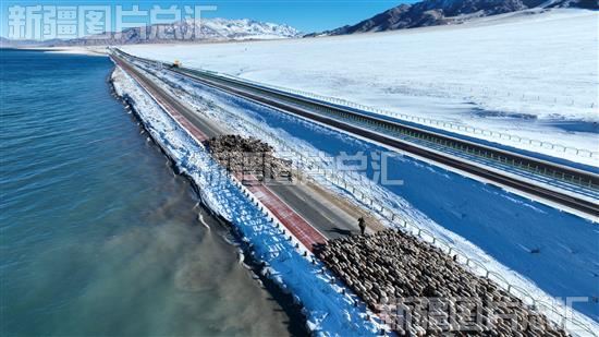 2022年11月28日,在赛里木湖旁的公路上,伊犁哈萨克自治州8.6万只(头)牲畜转入博尔塔拉蒙古自治州境内草场(无人机拍摄)。