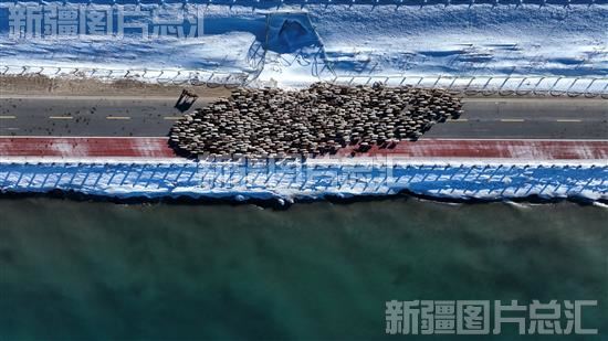 2022年11月28日,在赛里木湖旁的公路上,伊犁哈萨克自治州8.6万只(头)牲畜转入博尔塔拉蒙古自治州境内草场(无人机拍摄)。
