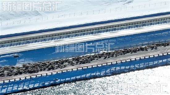 2022年11月28日,在赛里木湖旁的公路上,伊犁哈萨克自治州8.6万只(头)牲畜转入博尔塔拉蒙古自治州境内草场(无人机拍摄)。
