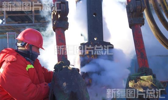 2022年11月28日,准东钻井公司70089钻井队石油工人冒着严寒在新疆克拉玛依金龙2油区JLHW258井场,用蒸汽为设备除冰,为新井开钻做准备。