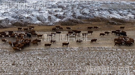 2022年11月30日,在博乐市阿热勒托海牧场天莱香牛牧业园区放养的肉牛(无人机拍摄)。