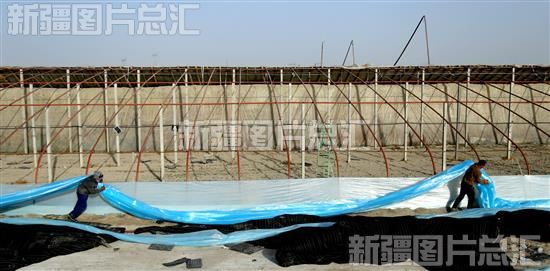 2022年12月1日,新疆生产建设兵团第二师22团三连设施农业大棚基地,职工为大棚搭膜。