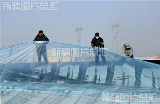 2022年12月1日,新疆生产建设兵团第二师22团三连设施农业大棚基地,职工为大棚搭膜。