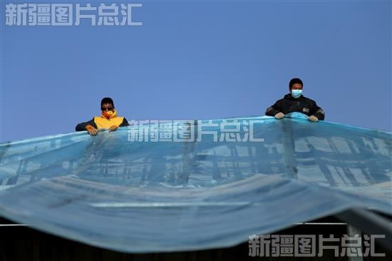 2022年12月1日,新疆生产建设兵团第二师22团三连设施农业大棚基地,职工为大棚搭膜。
