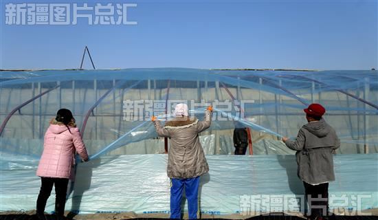 2022年12月1日,新疆生产建设兵团第二师22团三连设施农业大棚基地,职工为大棚搭膜。