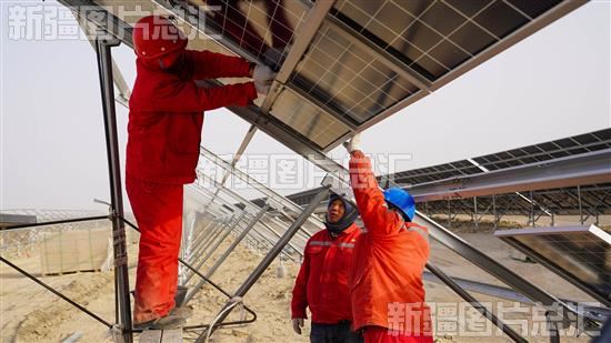 2022年11月30日,尉犁县10万千瓦光伏发电项目建设现场,工人们加紧施工安装光伏发电板。