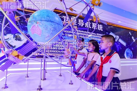 2022年7月20日,学生在呼图壁县科技馆参观北斗卫星导航系统模型。