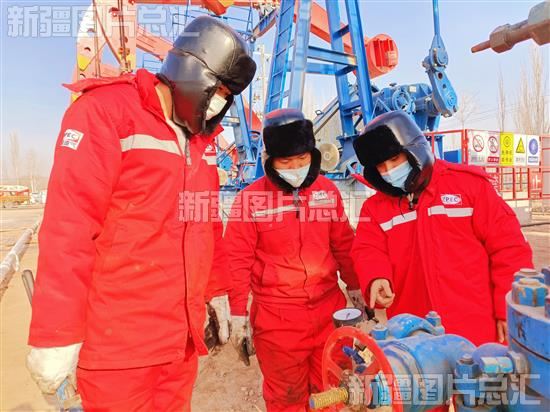 2022年12月14日,位于温宿县托乎拉乡托万克苏布拉克村的中曼阿克苏油田温13采油井,采油工人在观察压力表。