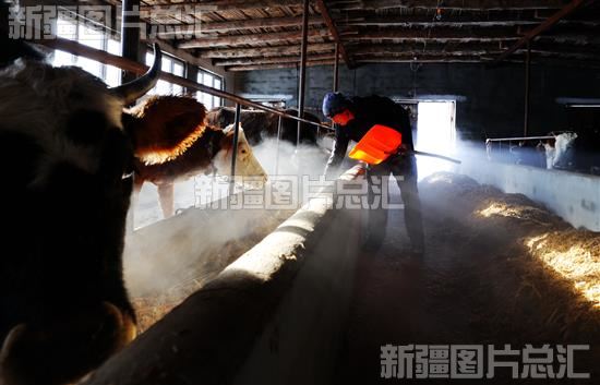 2022年12月14日,阿勒泰市红墩镇多拉特村养殖户在投喂饲料。