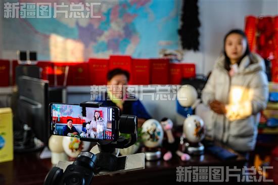 2022年12月13日,呼图壁县大丰镇高桥村科祥鸵鸟养殖农民专业合作社员工现场直播销售鸵鸟蛋工艺品。