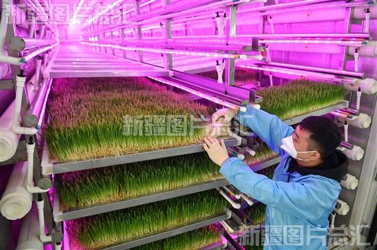 2022年12月13日,新疆紫晶川梭高新农业股份有限公司智能种草工厂员工在查看智能种草箱内饲草的长势。