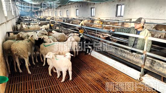 2022年12月13日,察布查尔锡伯自治县坎乡格拉木村金明农业综合开发专业合作社多胎羊养殖基地,饲养员正在查看羊羔生长情况。
