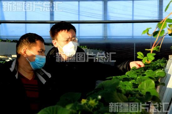 2022年12月15日,在裕民县新地乡智慧有机农业采摘园内,“访惠聚”工作队队员正在查看草莓生长情况。