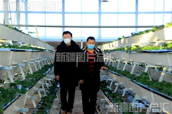 2022年12月15日,在裕民县新地乡智慧有机农业采摘园内,“访惠聚”工作队队员正在查看草莓生长情况。