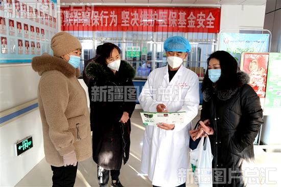 2022年12月18日,新疆生产建设兵团第二师22团医院,医护人员在向前来就诊的居民进行冬季流行性疾病科普宣传。