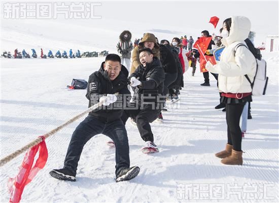 2022年12月17日,昌吉市努尔加滑雪场,游客在进行雪地拔河比赛。