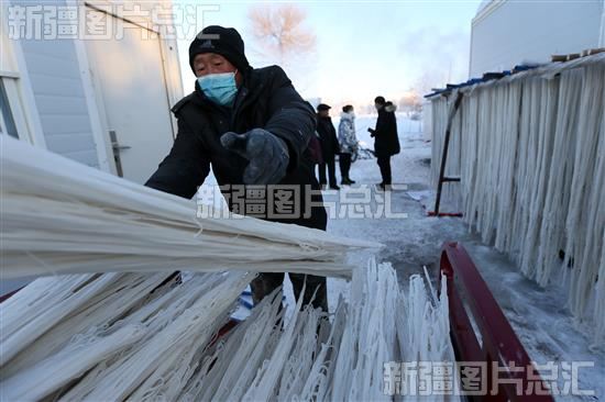 2022年12月19日,木垒哈萨克自治县英格堡乡月亮地村,一家粉条加工厂的工人正在将做好的粉条装车。