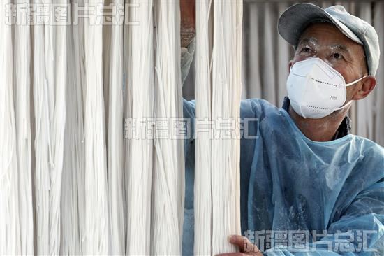 2022年12月19日,木垒哈萨克自治县英格堡乡月亮地村,一家粉条加工厂的工人正在晾晒手工粉条。