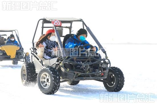 2022年12月22日,游客在博湖县博斯腾湖大河口景区体验雪地越野。