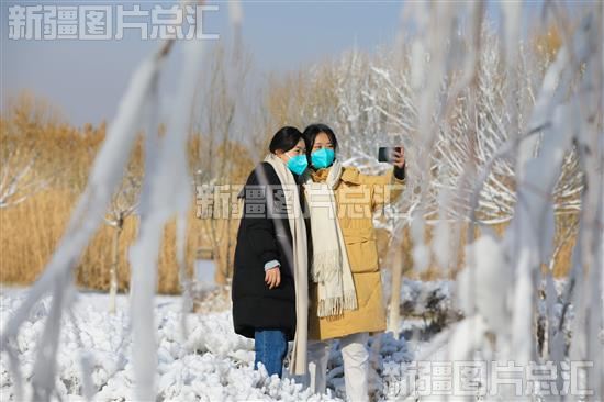 2022年12月22日,游客在博湖县博斯腾湖大河口景区打卡拍照。