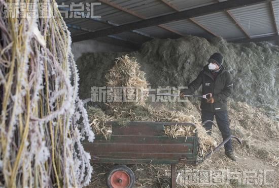 2022年12月22日,吉木萨尔县北庭镇西上湖村养殖户刘德亮正在驴圈里添加草料。