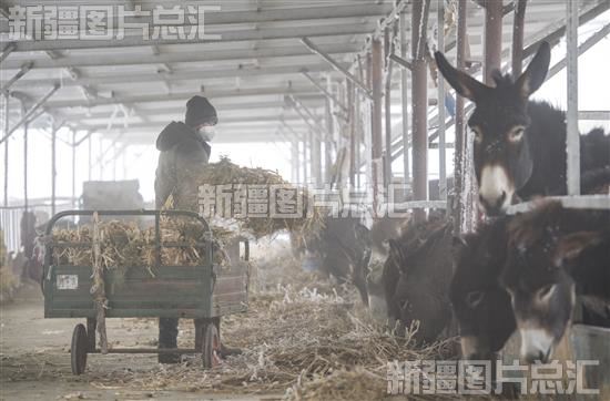 2022年12月22日,吉木萨尔县北庭镇西上湖村养殖户刘德亮正在驴圈里添加草料。