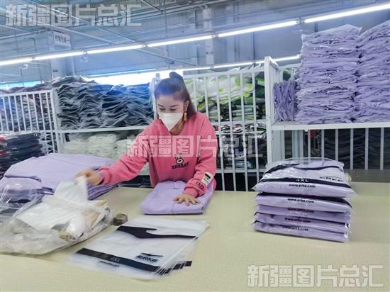 2022年12月20日,在位于于田天津工业园区的鸿星尔克有限公司,员工在生产车间打包成衣。