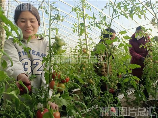 2022年12月26日,员工在阿克苏市喀拉塔勒镇萨提村蔬菜温室种植基地采摘西红柿。