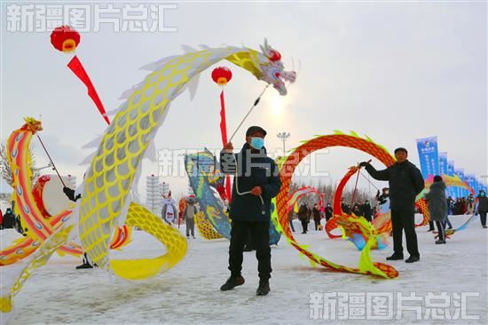 2022年12月23日,伊宁市第十六届“雪韵伊宁”冰雪文化旅游节暨加快旅游经济复苏系列活动启动仪式在伊犁河景区七彩广场举行。图为市民在舞龙表演。
