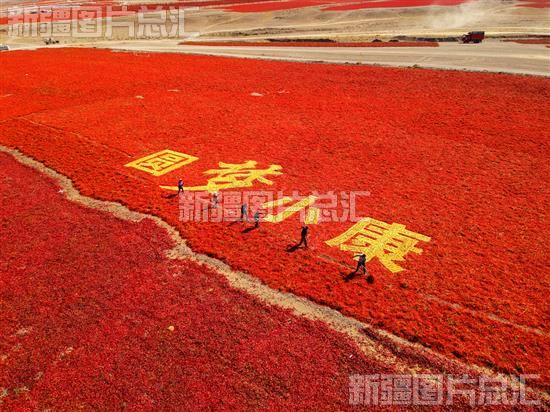 2020年9月,新疆维吾尔自治区沙湾市安集海镇的农民用辣椒和玉米在大地上拼出“圆梦小康”字样。