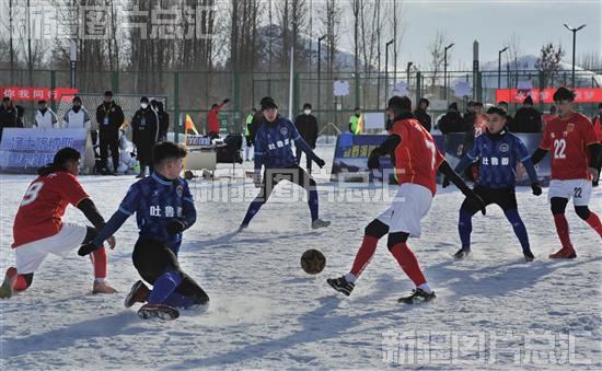 2023年1月1日,运动员在阿勒泰市全季体育公园足球场进行雪地足球比赛。