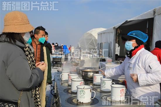 2023年1月1日,第九届全国大众冰雪季暨博湖县第十五届冰雪季系列活动在博斯腾湖大河口景区开幕。图为游客在购买缸子鱼等美食。