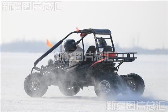2023年1月1日,游客在博湖县博斯腾湖大河口体验冰上摩托。